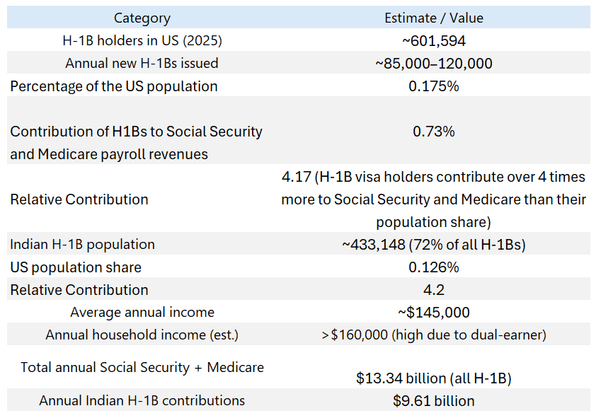 - Social Security & Medicare: H-1B holders contribute $13.34 billion annually, with Indian H-1Bs alone paying $9.61 billion.