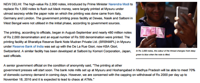 The story of demonitization starts way back in at least 2010 with a company named De La Rue and its role in fake currency in India.  Sometime during 2009-10, the CBI had raided around 70-odd Indian bank branches along the India-Nepal border and found counterfeit currency with them.  That sent shock signals all over the intelligence community.  Upon investigation, however, the intelligence officials found something even more scary!  The branches had received the currency not from some smugglers, but RBI itself!  RBI was sending counterfeit notes to the bank branches around the country!