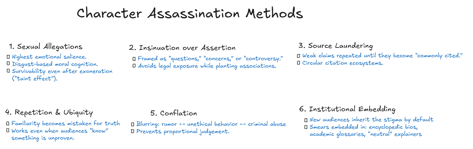 - Sexual deviance accusations: Alleging immoral or deviant sexual behavior to trigger disgust, moral panic, and lasting stigma regardless of evidence or refutation.