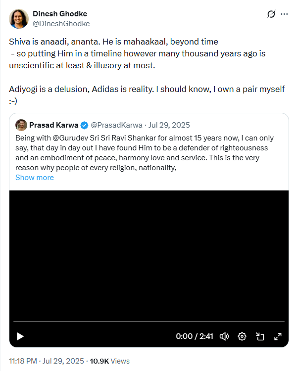 Publicly, casually, he demeaned the very concept of Adiyogi by comparing it to his shoes. Reducing a sacred archetype, revered across millennia of Shaiva and yogic tradition, to a trivial object meant to provoke laughter.
