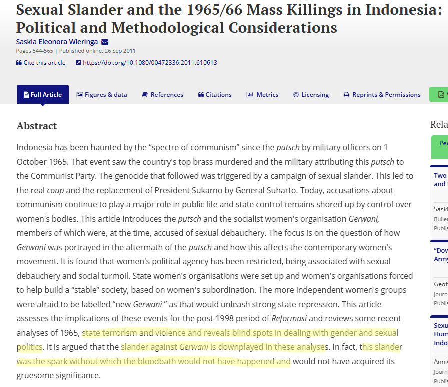 During the 1965-1966 mass killings in Indonesia, the military-led anti-communist propaganda campaign heavily relied on sexual slander against the socialist women's organization Gerwani. Members were falsely accused of sexual debauchery and mutilating army generals, which served as a pretext for the subsequent genocide and the establishment of an authoritarian regime that suppressed women's political agency.