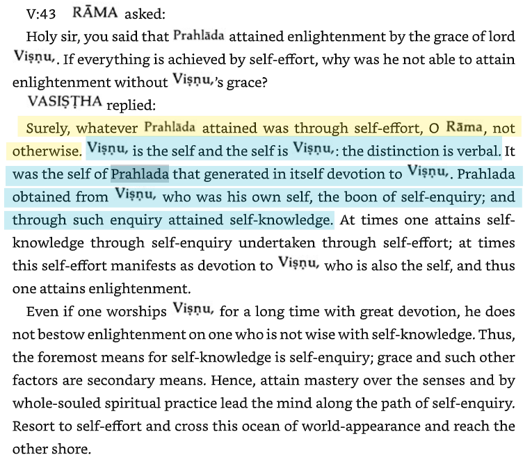 Vāsiṣṭha’s reply is decisive. What Prahlāda attained was indeed through self-effort alone. The reference to “Viṣṇu’s grace” is not ontological dependence but semantic shorthand.