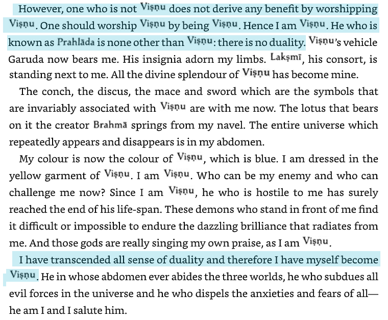 Prahlāda himself makes this explicit when he declares that one who is not Viṣṇu derives no benefit from worshipping Viṣṇu. This is not arrogance; it is Advaitic precision.