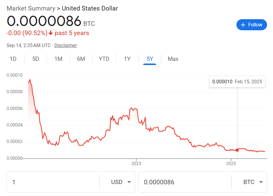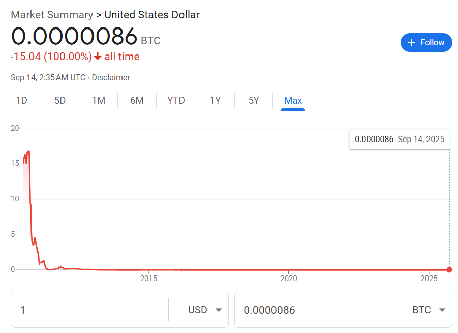 That represents more than a 99.9% collapse in the dollar’s value when measured against Bitcoin. This dramatic shift highlights Bitcoin’s role as a yardstick for fiat debasement.