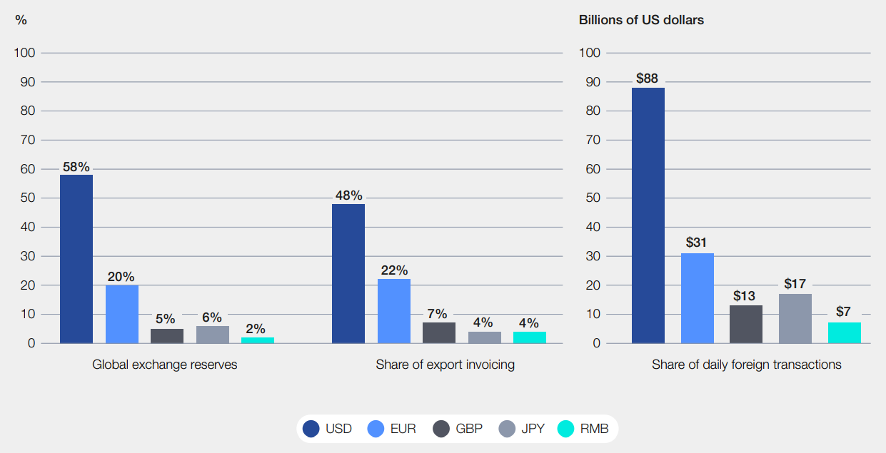 - 57.7% of global foreign exchange reserves, far exceeding the euro's 20% share.
