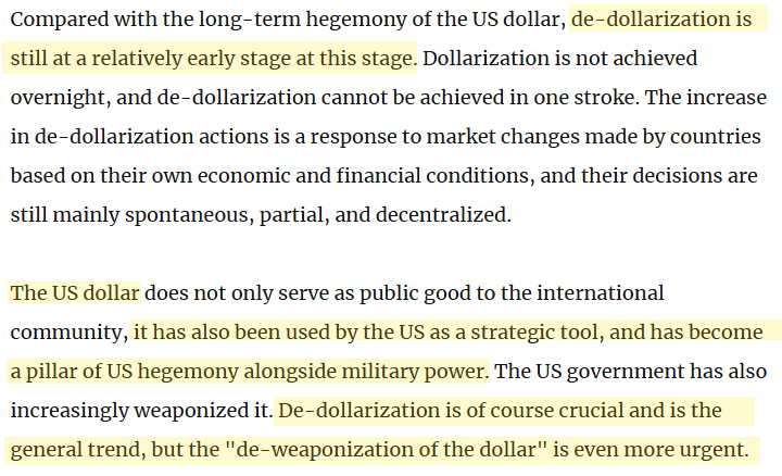 Dedollarization has gained importance even as USD still dominates global trade and flows. What BRICS etc are doing is Dollar Deweaponization. Dollar can be everywhere but without the teeth to unilaterally punish others and promote economic colonization.