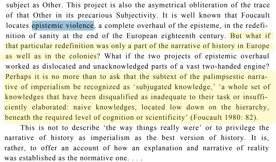 - Epistemic Violence (Spivak’s term): By controlling knowledge, the West silenced other traditions.