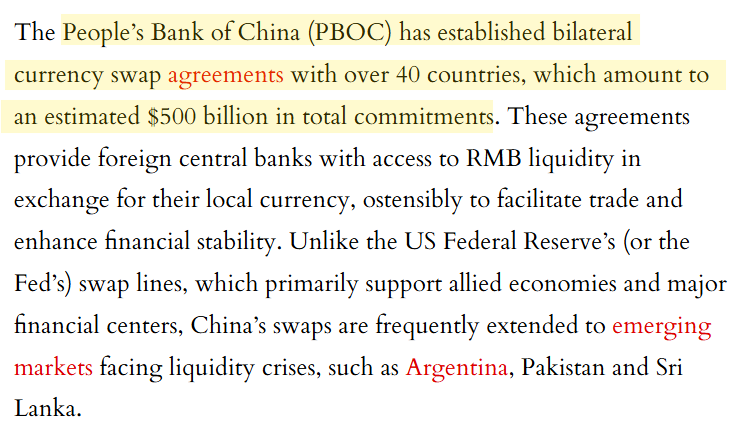 China has established currency swap lines with over 40 countries totaling $500+ billion, allowing those countries to trade with China in yuan and local currencies without using dollars.