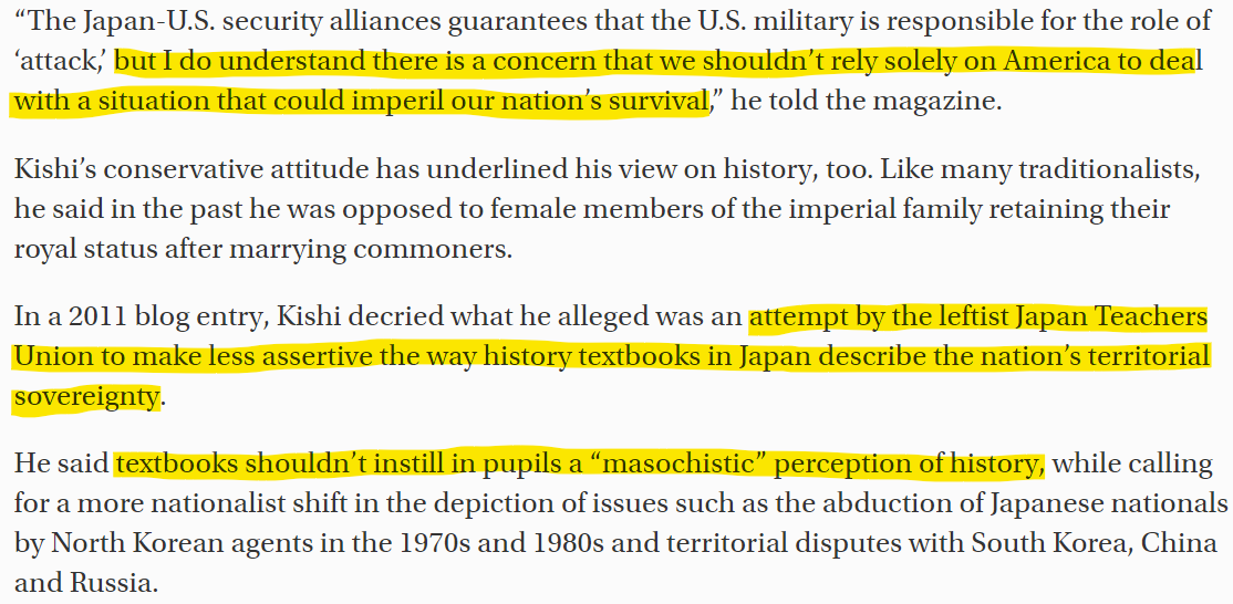 It is instructive to note that Nubuo Kishi, the current Japanese Defense minister's views mirror Abe's views exactly. What Abe set in motion is an institutional framework of national transformation. Not a personal agenda.
