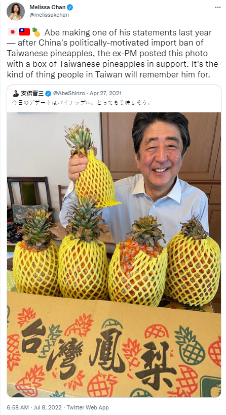 Last year when China banned Taiwanese pineapples, Abe posted this pic on Twitter with Taiwanese pineapples in support of the Taiwanese people.