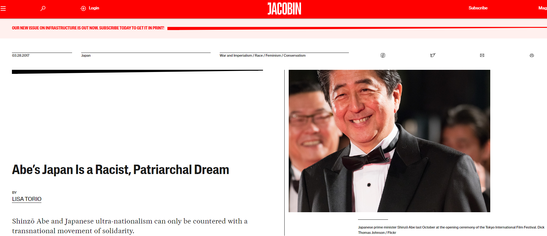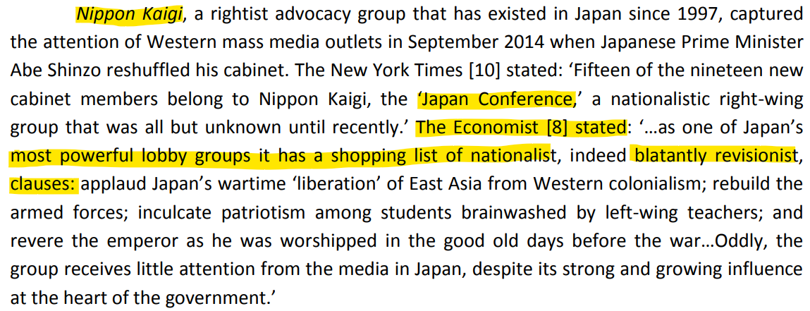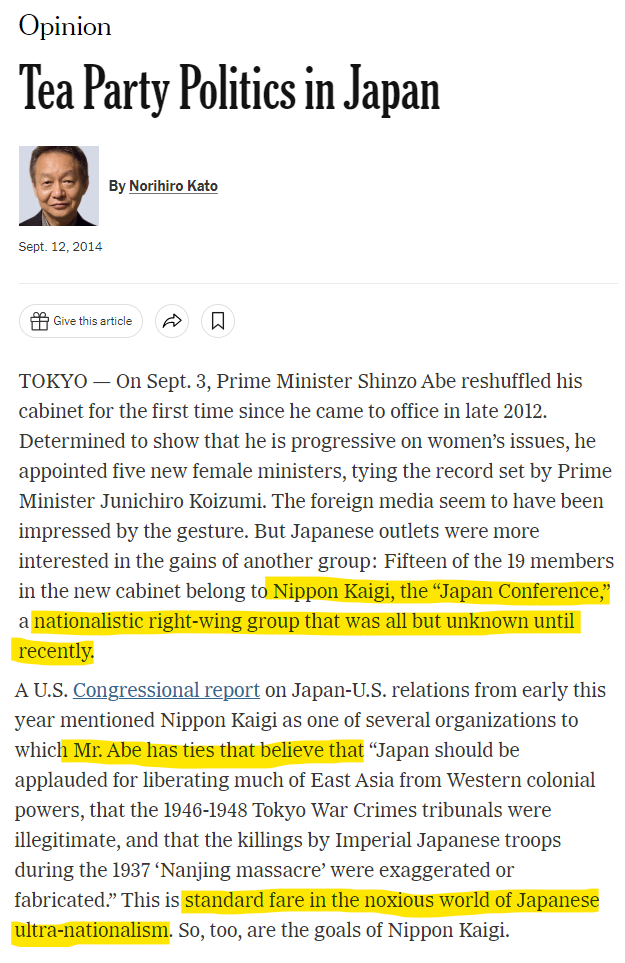 So, equating Abe's background to "Tea Party Politics" was a lazy yet effective way to drive home the point that Abe and Nippon Kaigi were the next worst things to Hitler. Specifically for the consumption of the American liberal populace which is exceptionally well-read in reductionist metaphors and innuendo-laden worldview.