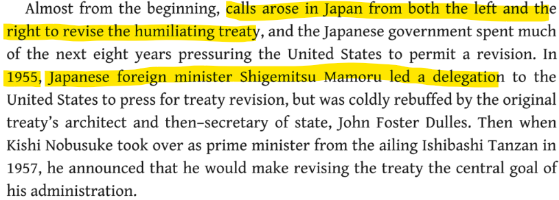 As is apparent by now that many in Japan saw the rules in the 1961 agreement and the Japanese Constitution to be demeaning and had reservations about the way Japanese history was written to make them ashamed of who they are as people.