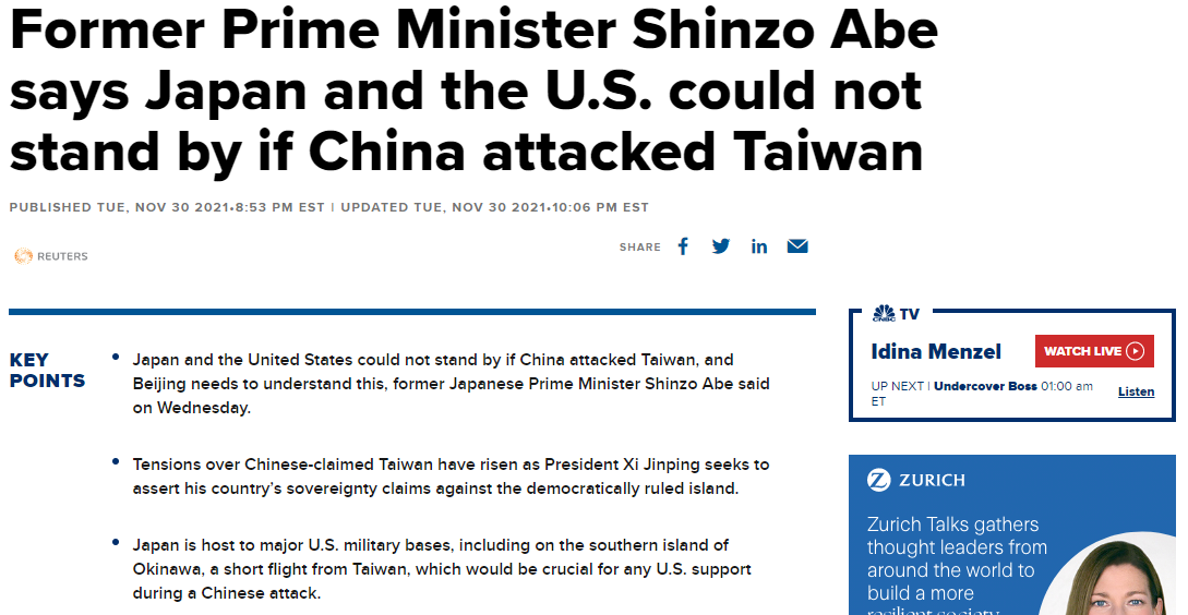 Later in November, Abe stated that if China were to attack Taiwan, the US and Japan will not just stand by.