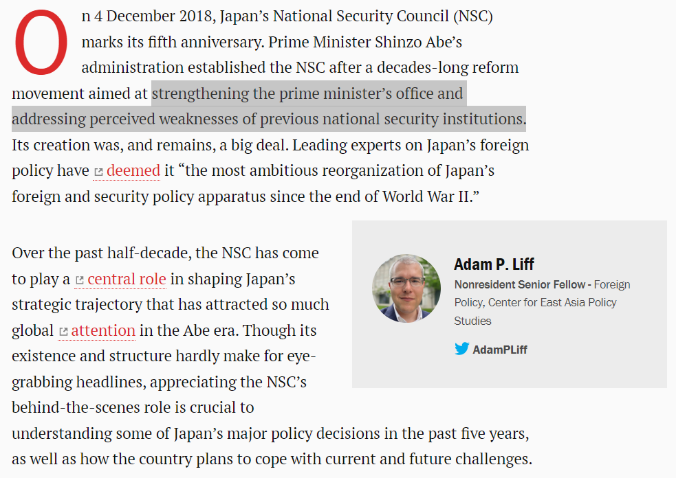 For example, he established Japan’s National Security Council (NSC). Its central objective was "strengthening the prime minister’s office and addressing perceived weaknesses of previous national security institutions."