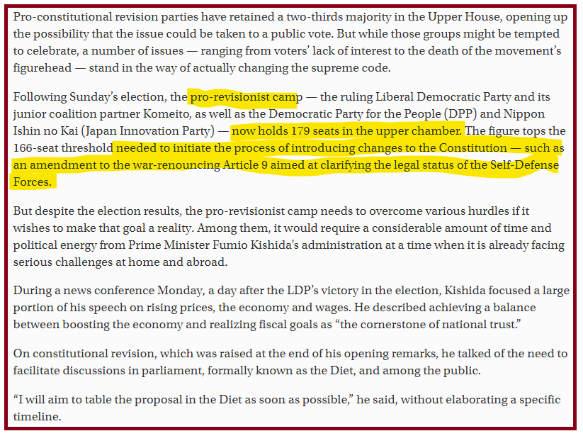 The elections resulted in a landslide for Shinzo Abe's party giving them a two-thirds majority needed to revise the Constitution. Thus fulfilling Shinzo Abe's dream.