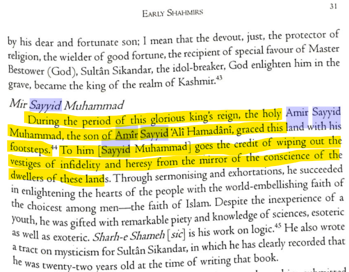 Sikandar Shah or Sikandar Butshikan (Sikandar the Iconoclast) was the 6th Sultan of the Shah Miri dynasty in Kashmir from 1389 to 1413. Backed by Sultan Sikandar, Sayyid Ali Hamdani - popularized as a Sufi poet - worked to wipe out Hindus from the land of Kashmir.