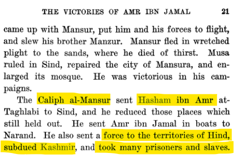 The attacks on Kashmir happened very early in Islamic history. The second Abbassid caliph, Al-Mansur had sent forces to Kashmir and took many prisoners and slaves.
