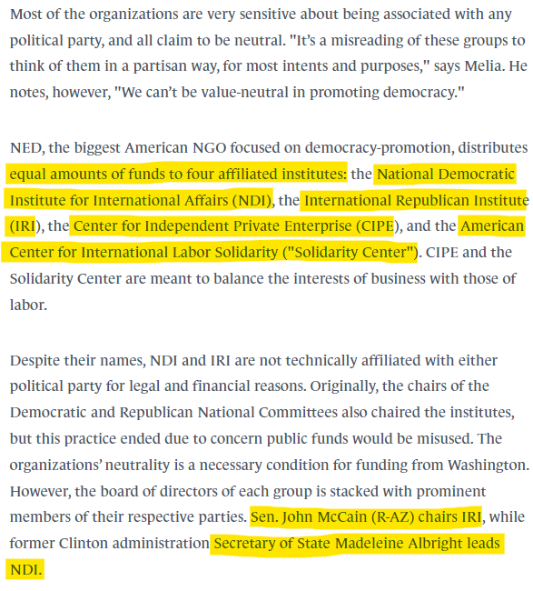 Despite claims to the contrary, the NED funds groups from both Democratic and Republican parties, the business community, and the Labor unions.