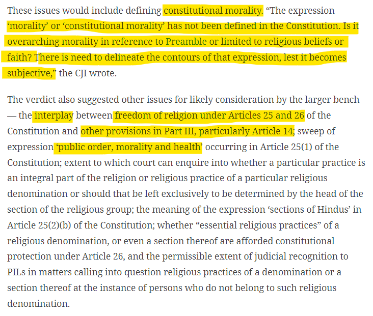 In turning to a larger Bench, three of the five judges on the Constitution Bench — Chief Justice of India Ranjan Gogoi, Justices A M Khanwilkar and Indu Malhotra — sought clarity on issues ranging from the essential religious practice test, including the “apparent conflict” between rulings in the Shirur Mutt case and Durgah Committee, Ajmer; entry into a mosque/durgah by Muslim women and into an agyari by Parsi women married to non-Parsis; the interplay between freedom of religion under Articles 25 and 26 of the Constitution and other provisions in Part III, particularly Article 14; and, the definition of constitutional morality. (Indian Express - Source)