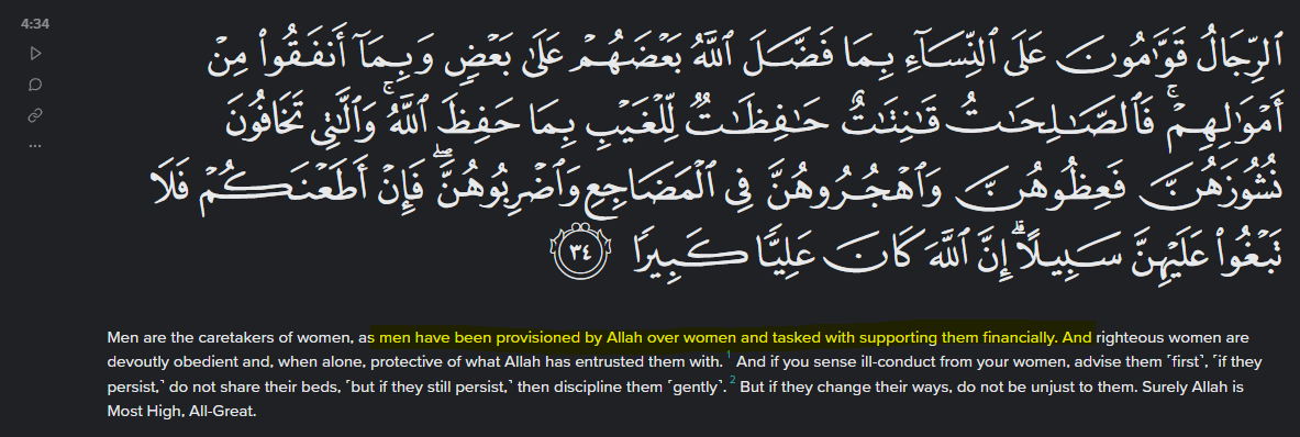 In Quran Surah An-Nisa 4:34, Allah tells Muhammad that "Men are in charge of women, because Allah hath made the one of them to excel the other, and because they spend of their property (for the support of women). So good women are the obedient, guarding in secret that which Allah hath guarded. As for those from whom ye fear rebellion, admonish them and banish them to beds apart, and scourge them. Then if they obey you, seek not a way against them. Lo! Allah is ever High, Exalted, Great." (Pickthall - Source)