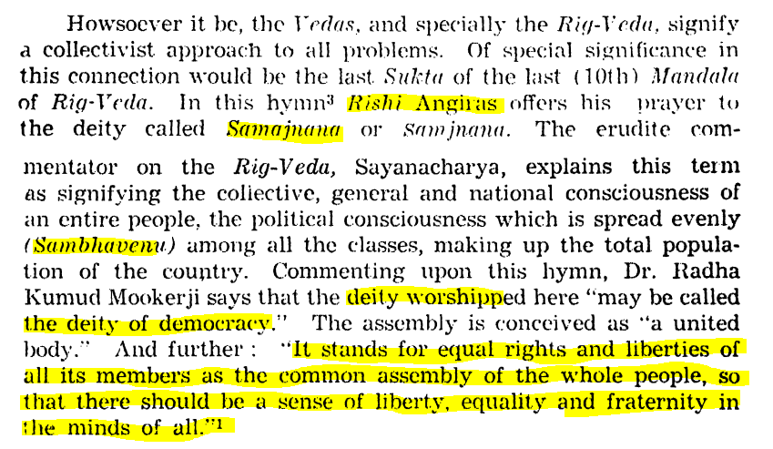 In Rig Veda (last Sukta of the 10th Mandala), Rishi Angiras offers his prayers to a special deity "Samajnana". Sayancharya, the great Vedic scholar during the Vijaynagar rule, called this deity - the keeper of "Collective, general and national consciousness of an entire people, the political consciousness which is spread evenly (Sambhavenu) among all classes, making up the total population of the country."