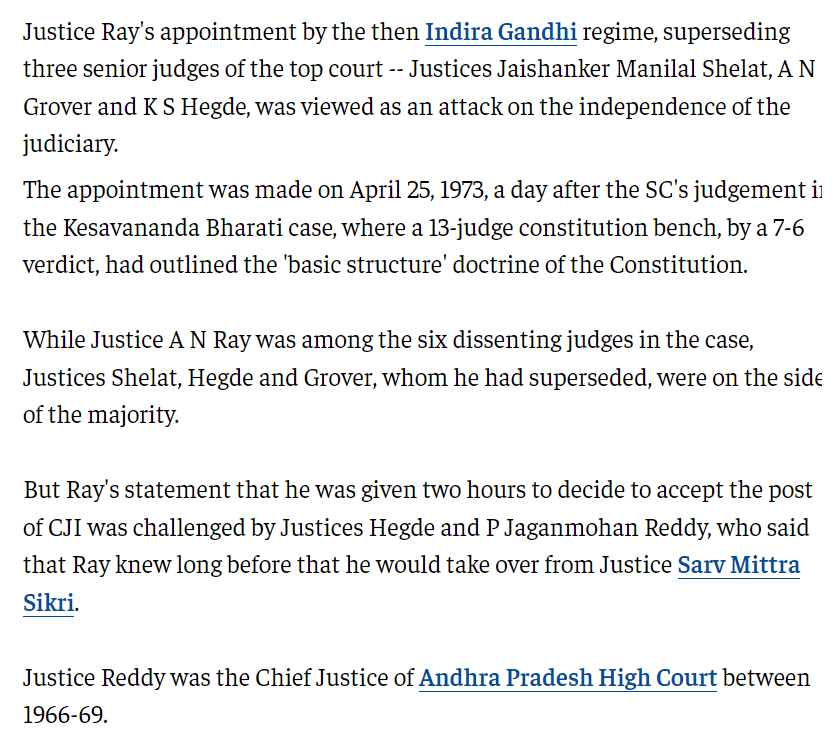 The Chief Justice AN Ray was a controversial figure and one who was amenable to influence from the then PM Indira Gandhi (and her personal secretary - Source). His appointment as the Chief Justice came on the heels of the verdict in the Kesavanand Bharti case. Justice Ray superseded three senior judges - Supreme Court, Jaishanker Manilal Shelat, AN Grover, and K. S. Hegde.