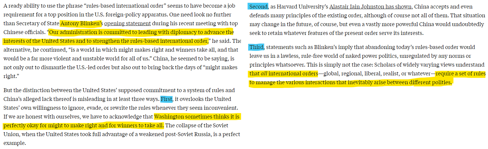OK, but which rules, exactly, is America upholding? Biden administration officials don’t say. In fact, they never clearly define the term at all. Arguing about phrases like “rules-based order,” the political scientist Patrick Porter has noted, is like “wrestling with fog.” That’s exactly the point. Since the “rules-based order” is never adequately defined, America’s claim to uphold it can never be disproved. (Source: NYTimes)