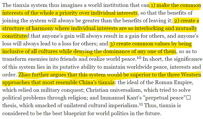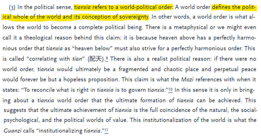 Per Zhao, Tianxia has a trinitarian conception - Geographic, Social psychology, and Political. In our discussion, the political component becomes critical.