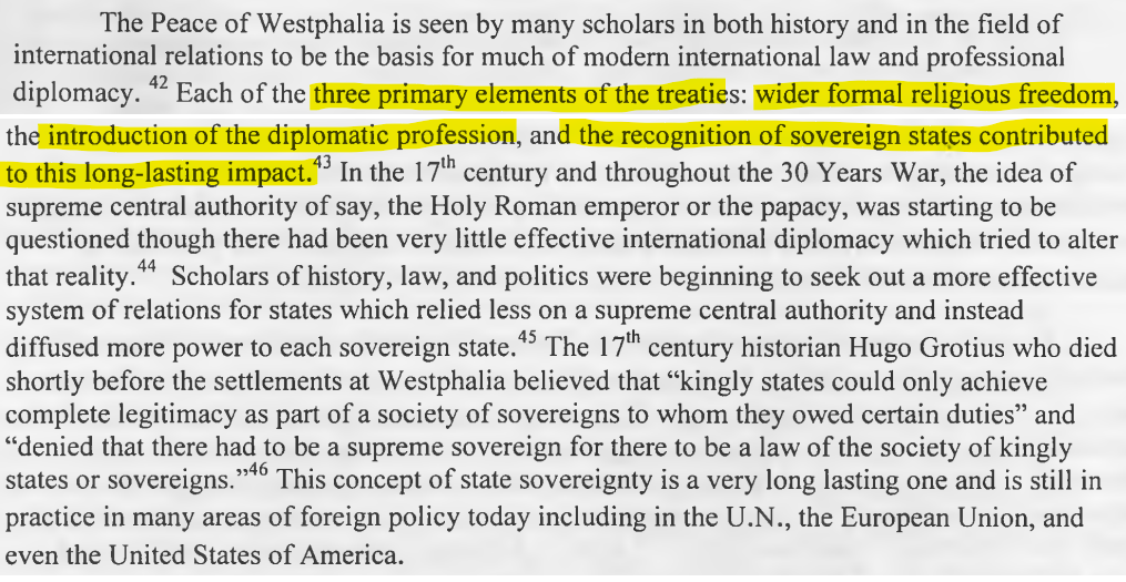 In fact, its foundational elements are from the treaty called the "Peace of Westphalia," which had its basis in the conflict that involved the Church and the people.