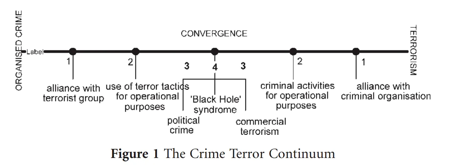 Tamara Makarenko shares a continuum of crime and terror world in her article - “The Crime–Terror Continuum: Tracing the Interplay between Transnational Organised Crime and Terrorism”
