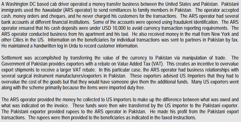 In another report, FATF explains how the Pakistan Government's taxation laws, Export-Import business, and private organizations use creative ways and Alternative Remittance Systems (ARS) to do money laundering.