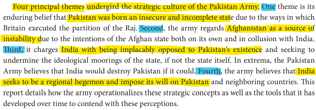 Pakistan's very existence is predicated on how it has seen itself vis-a-vis India. Based on those assumptions and ideological moorings, the entire Strategic Culture, as Christine Fair calls it, has emerged. Four themes have been identified in Fair's analysis of the Pakistani establishment's literature: