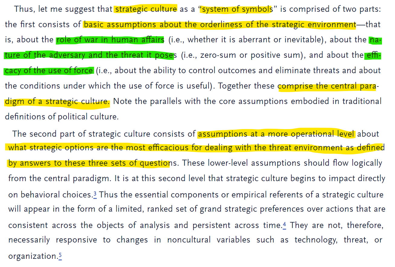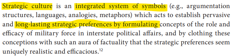 Strategic Culture, as defined by Alistair Iain Johnston, is an integrated system of articulating the deepest values of the "establishment" such that they drive every aspect of social and governance interaction.