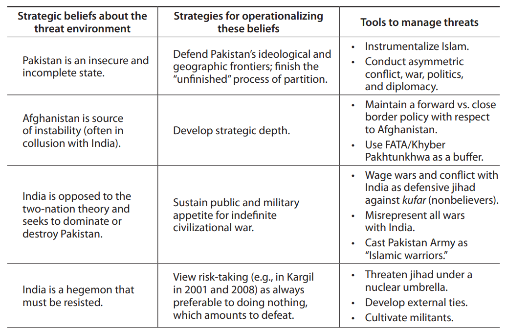 Christine Fair shares an interesting table that lays out the actions taken to operationalize the strategic beliefs based on how the Strategic Culture was consciously defined by Pakistan.