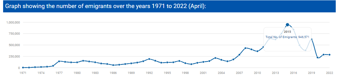 In fact, the official website of the government of Pakistan also confirms the trend. From a high of 946k (2015), the number of emigrants has fallen to the 2007 levels of around 286k.
