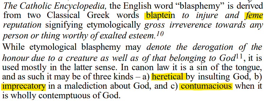 The Catholic Encyclopedia defines Blasphemy as something that denotes derogation of the honor due to a creature as well as of that belonging to God.