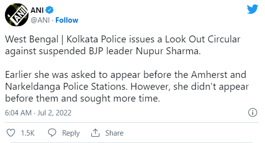 Approach all the High Courts: Isn't that what Nupur Sharma was trying to avoid? Apart from the legal part, Nupur Sharma faces an imminent threat in West Bengal. The Chief Minister has openly targeted Nupur Sharma and chided the Delhi Government for not arresting her. (Source) Not just that, the West Bengal Assembly has passed a censure motion against Nupur Sharma. (Source) If she presents herself in Bengal, she is sure to be arrested. As one would have it, the Kolkata Police with complete disregard for Nupur's life has issued a "lookout circular".