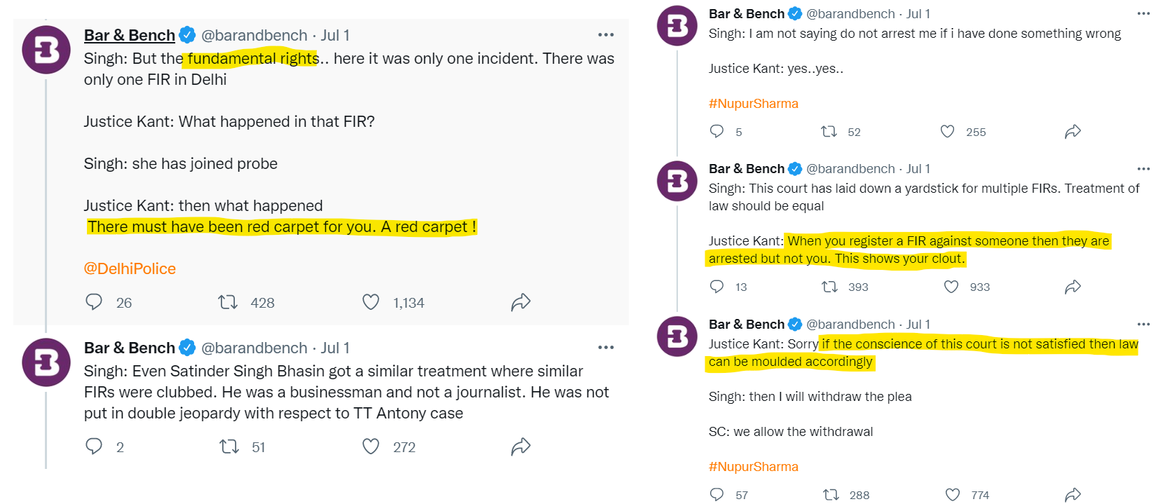 Freedom of a Journalist Vs Freedom of a "Political spokesperson": How is the job of a person important when the Freedoms and Rights are concerned under the Indian constitution? This is a faux caste/class system being perpetrated by the Indian Supreme Court now. When it comes to protection under the Indian laws, it would be a travesty if the courts refer to a person's job description before making statements. That Nupur's job had no bearing on the threats that she is receiving is evident from what happened in the cases of Kamlesh Tiwari and Kishan Bharwad.