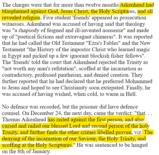 Hanging for blasphemy happened as late as January 1697. Of Thomas Aikenhead - basically for denying the veracity of the Old Testament and the legitimacy of Christ's miracles.