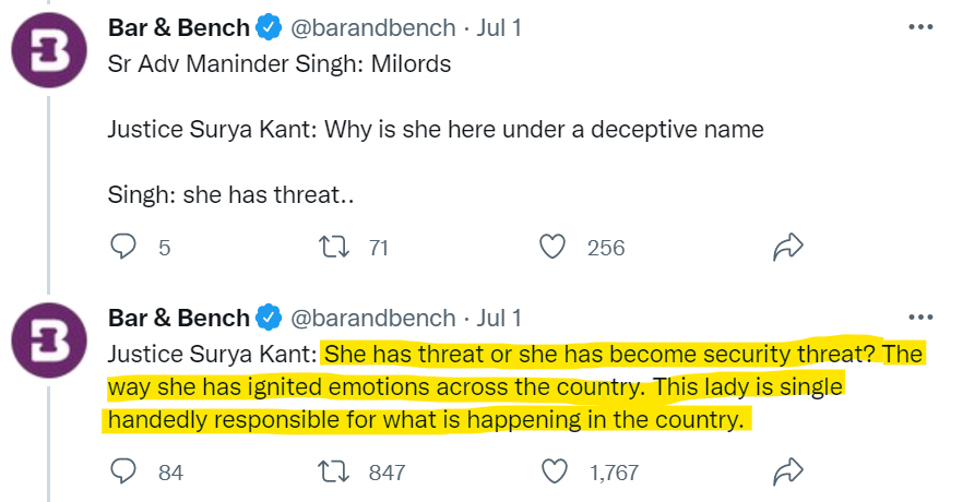 SINGLE-HANDEDLY: By far, this one phrase uttered by Justice Suryakant will end up being the most consequential to what happens in the future. He is putting the burden of all the murders, violence, and abuse on one unique source - Nupur Sharma. When Justice Kant makes Nupur Sharma squarely and singularly responsible for all the turmoil, he is suggesting that what she stated was blasphemy and that alone is what matters in this case. Nothing else. Not the crimes. Not the beheading. Not the baseness of the conspiracy to go after her which is reminiscent of Charlie Hebdo. Not even the threats to India's PM. But her remarks, that she had complete right to make being an Indian citizen with her fundamental rights.