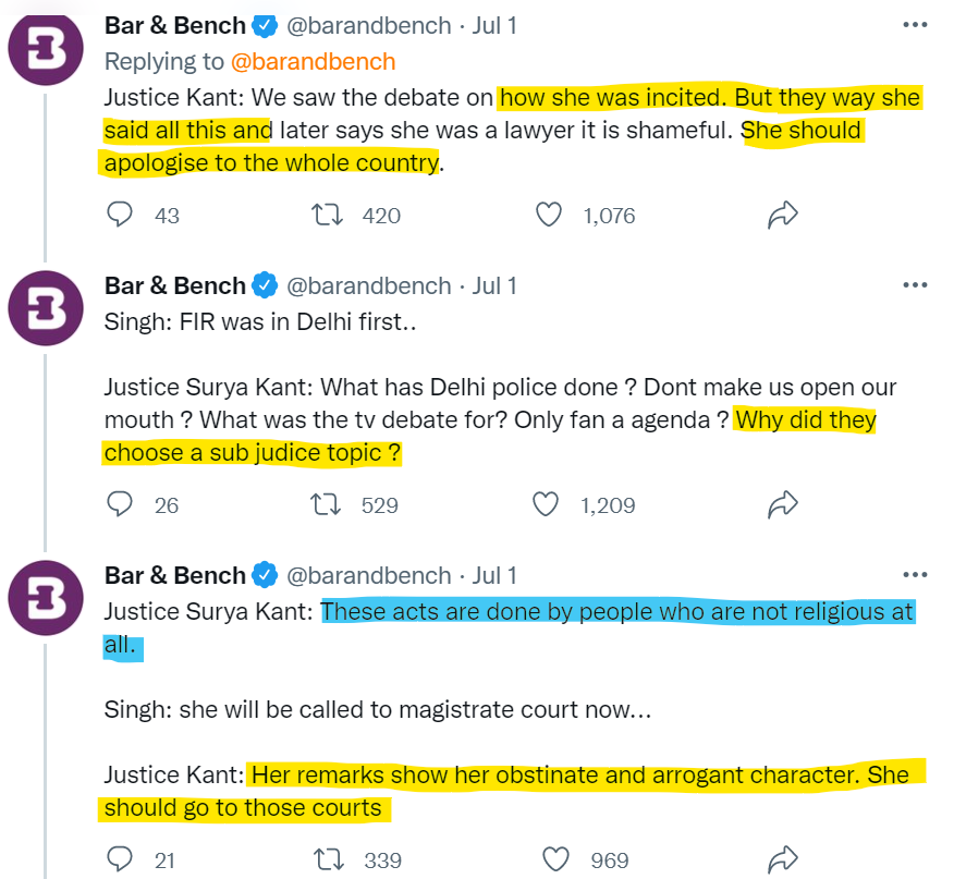 Acts by people who are not religious: This is not just a lie but extremely irresponsible coming from the judge. One is not sure what he is saying in the context of. The people who filed multiple FIRs? Or the Muslims who are baying for Nupur Sharma's blood? Or those who killed Kanhaiya Lal? If the cases of Kanhaiya Lal, Kishan Bharwad, and Kamlesh Tiwari are any indication, then the conspiracies in such cases are multi-dimensional and involve many elements. To be so facetious about that and completely disregard the explicitly religious element that the Muslims are shouting from the rooftops about and the obvious nature of "Blasphemy" being at the root is not just ignored but wilfully suppressed! Why?