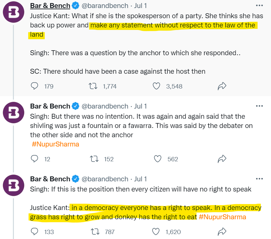 After laying the foundation for Blasphemy laws as stipulated in Sharia and medieval Christian covenants to be applied to Nupur Sharma, the judge then goes on to maul the very basis of the right to Freedom of Speech.