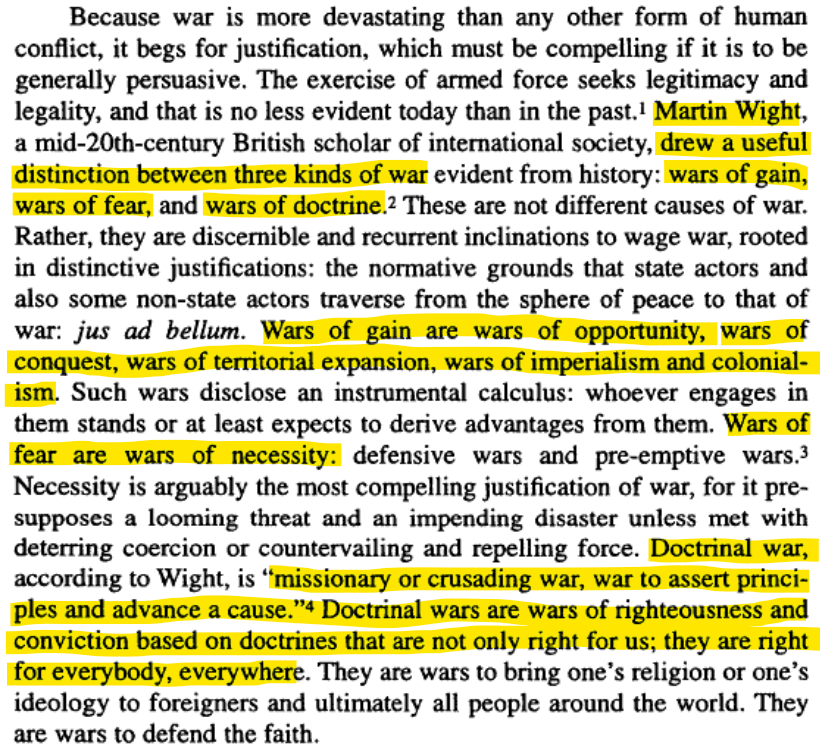 A Christian pacifist yet staunch believer, Martin Wight who wrote on International Relations, distinguished between the type of wars and drew a distinction between the motivations behind the wars - Gain, Fear, Doctrine. Doctrinal wars were wars, he said, of asserting righteousness based on doctrines that are not just "right for us but for everybody, everywhere."