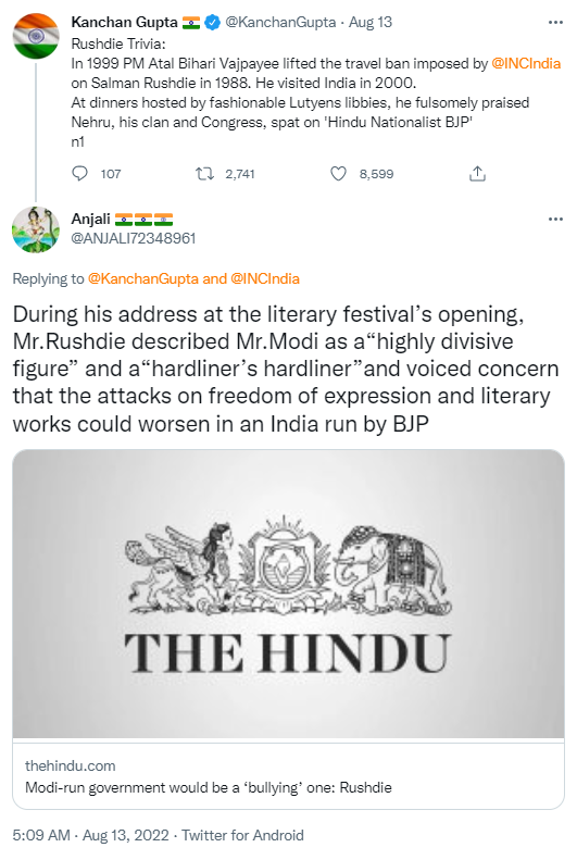 What did Rushdie do when he came to India? He criticized the BJP for being "Hindu Nationalists" and praised Congress for their liberal ways. Go figure!