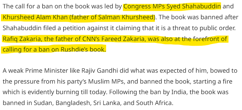 In 1988 Congress on the insistence of Syed Shahabuddin, Khursheed Alam Khan (Salman Khursheed's Father) and Rafiq Zakaria (CNN's Fareed Zakaria's father) banned the book Satanic Verses ahead of all other countries.