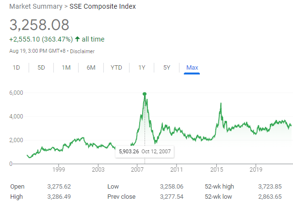 The Shanghai Stock Exchange (SSE) Composite Index - China's main stock market index - is currently at 55% of its highest level. That peak was way back in October 2007.