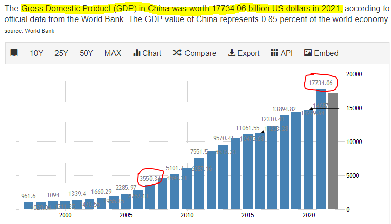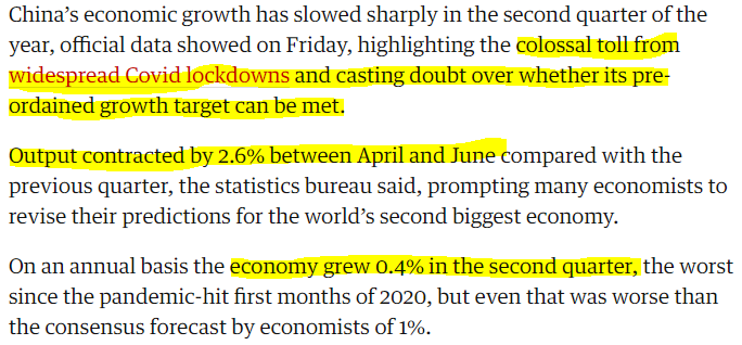 The Chinese Communist Party (CCP) politburo had predicted annual growth of 5.5% in April 2022. In July 2022, the International Monetary Fund put that growth to 3.3%. (Source: IMF) From 18% to 3.3%!