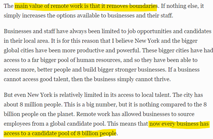 For businesses, this means that they are not restricted to the locally available talent but they can draw upon the entire global pool. For example, a business in New York is not restricted to 8 million people as its talent pool. It now has access to 8 billion people!