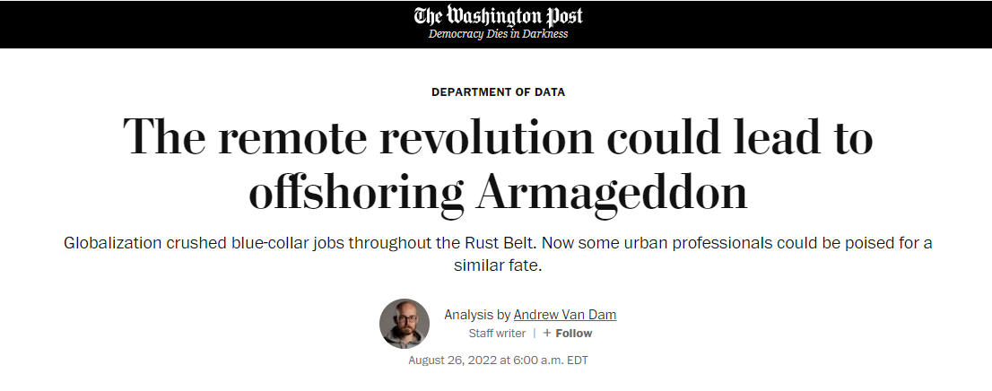 Andrew Van Dam thinks that remote work will do to the white collar jobs what offshoring of manufacturing from the Rust Belt in the US did to the population there.