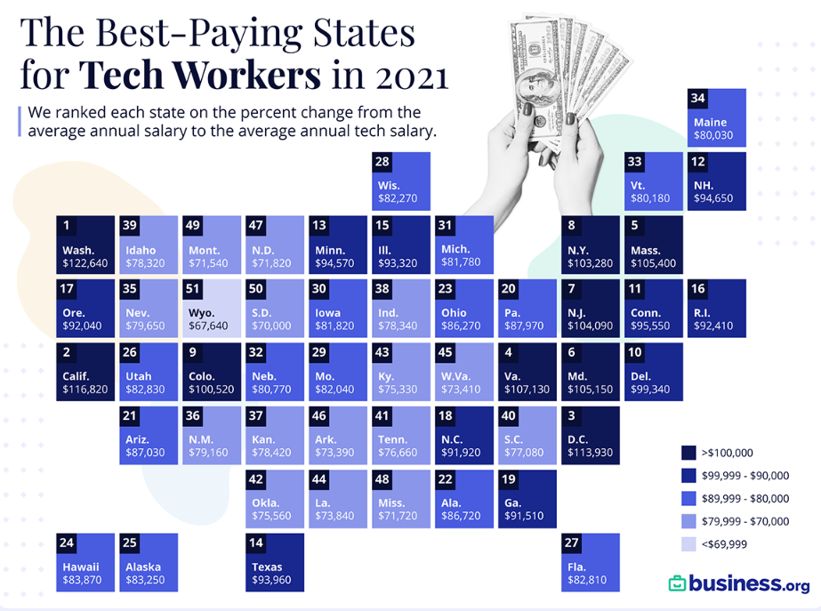 In a 2019 survey, for example, the average IT salaries were vastly different in different states.